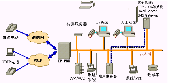 IP PBX系統(tǒng)代替?zhèn)鹘y(tǒng)PBX交換機系統(tǒng),實際上是一個SIP或H.323交換機,內(nèi)部分機采用純IP電話,提供呼叫路由、話務(wù)員分組管理、呼叫控制等功能,支持市場上主流IP