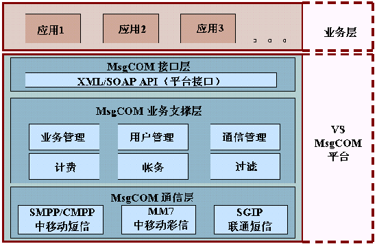 上海聲軟公司(www.voicesoft.com.cn)的MsgCOM通信平臺在國內創(chuàng)造性地將業(yè)務和平臺分開,利用先進的XML/SOAP技術進行二次開發(fā)定制業(yè)務應用,以下是它的系統(tǒng)邏輯結構圖: