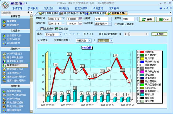 座席綜合統(tǒng)計:可以根據(jù)“月份”、“天”、“小時”來統(tǒng)計每一個座席的綜合指標(biāo)。統(tǒng)計的指標(biāo)包括:總登錄時長、空閑時長、呼入電話數(shù)、呼入時長、平均呼入時長、呼出電話數(shù)、呼出時長、平均呼出時長、通話總數(shù)、通話總時長、后處理時長、平均后處理時長、AUX總時長、電話振鈴時長、平均振鈴時長、轉(zhuǎn)移次數(shù)、磋商次數(shù)、保持次數(shù)、平均保持時長。