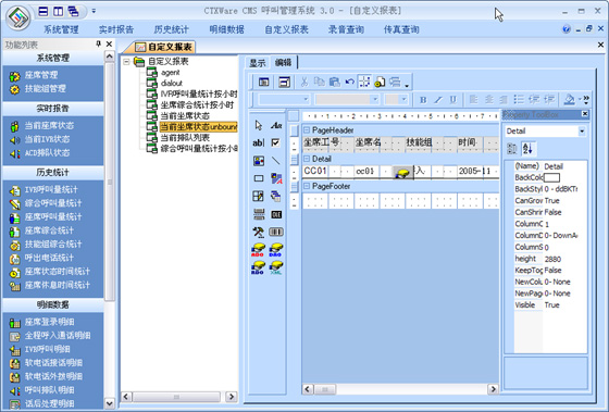 CMS是有效的對呼叫中心進行監(jiān)視和管理的系統(tǒng)。它可以實時監(jiān)控整個呼叫中心的當(dāng)前數(shù)據(jù),按照座席、技能組、中繼線、隊列、路由進行監(jiān)視,查看座席服務(wù)狀態(tài)及接通率各種指標(biāo),通過各項實時記錄和歷史記錄向用戶提供多種綜合分析報告和統(tǒng)計報告。其所生成的上百張報表,可以協(xié)助企業(yè)有效管理資源,檢查成本,預(yù)測改善現(xiàn)有運作的潛在需求。并提供圖表顯示,生成Excel文檔進行再編輯,或者通過標(biāo)準(zhǔn)的報表形式進行編輯。支持自定義報表。