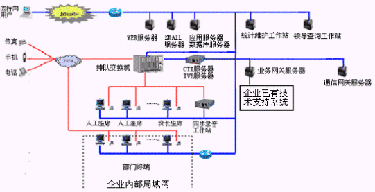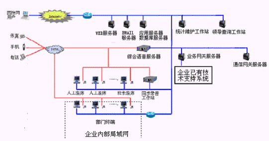 網(wǎng)上服務(wù)系統(tǒng):與INTENET結(jié)合,接受來(lái)自網(wǎng)上的呼叫請(qǐng)求,提高服務(wù)和營(yíng)銷的質(zhì)量和效率。