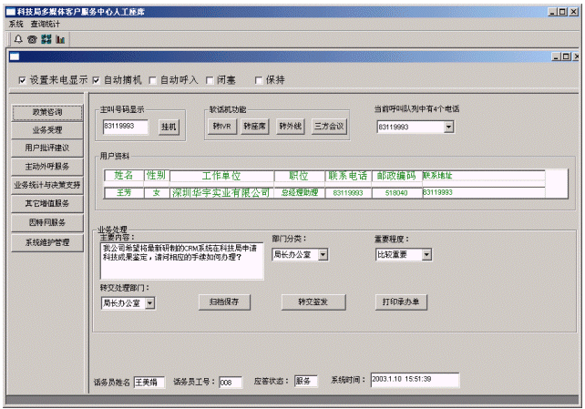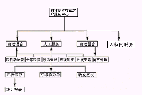 企業(yè)或個(gè)人打入電話后,可以選擇人工服務(wù),同座席話務(wù)人員直接溝通,由話務(wù)人員將企業(yè)或個(gè)人反映的問題和提出的建議意見記錄下來,并同時(shí)記錄下該客戶的聯(lián)系方式,將相關(guān)數(shù)據(jù)添加入系統(tǒng)數(shù)據(jù)庫;也可以在數(shù)據(jù)庫的支持下回答企業(yè)或個(gè)人對(duì)科技成果和政策法規(guī)的咨詢和疑問。企業(yè)或個(gè)人也可以選擇自動(dòng)語音服務(wù)方式,根據(jù)系統(tǒng)的語音提示輸入按鍵,選擇類別,將自己的投訴和建議以及自己的聯(lián)系方式信息以留言錄音的方式保存在系統(tǒng)中。系統(tǒng)同時(shí)還支持自動(dòng)傳真方式,企業(yè)或個(gè)人可以通過傳真機(jī)打通客戶服務(wù)中心,通過按鍵選擇傳真方式,將自己的意見建議等的文本內(nèi)容傳真給系統(tǒng),系統(tǒng)自動(dòng)接受并存入數(shù)據(jù)庫。