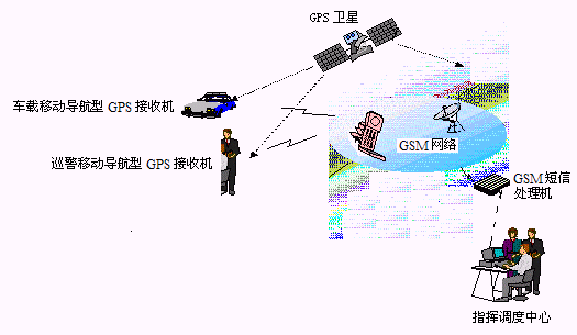 巡警利用移動(dòng)終端(帶手機(jī)通信功能的GPS接收機(jī))發(fā)出報(bào)警信號(hào),通過(guò)GSM系統(tǒng)送到指揮調(diào)度中心。