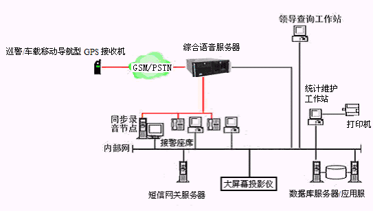 指揮調(diào)度中心包括智能接警處警平臺(tái),警用電子地理信息系統(tǒng)(GIS),數(shù)字錄音系統(tǒng)和大屏幕投影儀等。