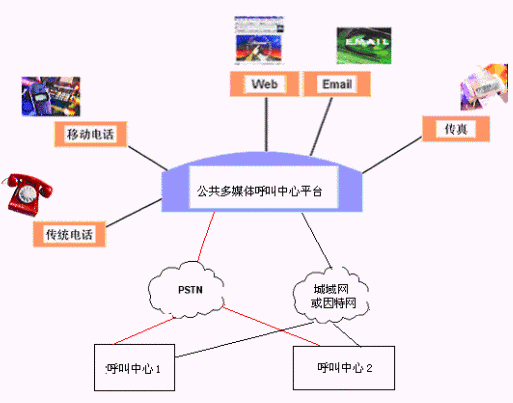客戶利用電話、傳真、電子郵件、因特網(wǎng)、手機、短消息等進入城市公共多媒體呼叫中心平臺,本系統(tǒng)依托現(xiàn)有各專業(yè)呼叫中心/使用城市公共多媒體呼叫中心平臺租賃服務(wù)的企事業(yè)單位的各類業(yè)務(wù)技術(shù)支持系統(tǒng)和網(wǎng)絡(luò)系統(tǒng),通過人工受理或自動語音服務(wù)等方式全天24小時不間斷地為客戶提供各種服務(wù)。