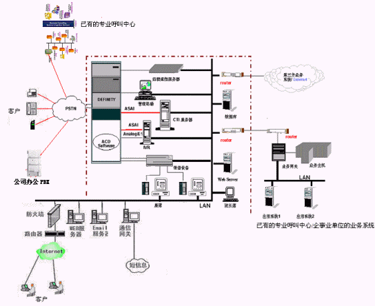 逐步實現(xiàn)共享已有呼叫中心業(yè)務(wù)系統(tǒng)的資源:通過城域網(wǎng)或因特網(wǎng)實現(xiàn)與現(xiàn)有呼叫中心相關(guān)業(yè)務(wù)系統(tǒng)的連接與集成,諸如業(yè)務(wù)數(shù)據(jù)的提取等。在逐步完善服務(wù)手段和服務(wù)內(nèi)容,完善中心內(nèi)部的流程與規(guī)范化的建設(shè)的基礎(chǔ)上,逐步替代現(xiàn)有的專業(yè)呼叫中心。