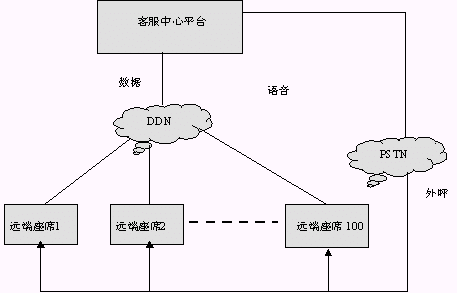 所謂PSTN+DDN的聯(lián)網(wǎng)方式是遠端座席和主呼叫中心的語音和數(shù)據(jù)互連是分開來的,彼此互相不干擾。語音方面遠端座席和主呼叫中心的相聯(lián)與前兩種方式不同,是主呼叫中心通過外呼將話路接到遠端座席處。數(shù)據(jù)方面遠端座席和主呼叫中心的相聯(lián)仍然直接通過DDN相連。