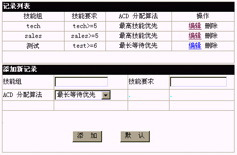 設(shè)置技能組:定義一個(gè)技能組名稱,給出一項(xiàng)技能的值范圍表達(dá)式,凡具備該技能且技能值屬于該范圍的座席,將自動(dòng)加入該技能組。