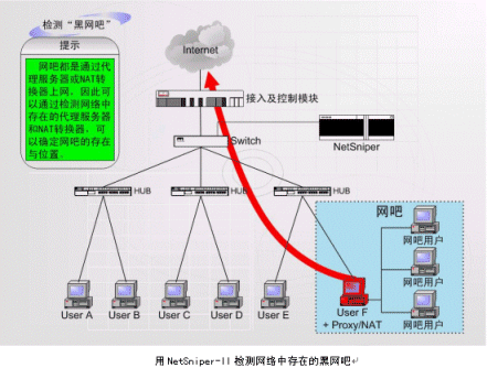 上圖中,NetSniper-II可以對(duì)網(wǎng)絡(luò)內(nèi)部各用戶進(jìn)行檢測(cè),一旦發(fā)生某個(gè)用戶安裝代理服務(wù)器軟件,其他用戶通過(guò)該用戶的接口上網(wǎng)偷逃網(wǎng)費(fèi)的情況,或發(fā)現(xiàn)盜用MAC地址上網(wǎng)及通過(guò)Modem回?fù)苌暇W(wǎng)的情況,NetSniper-II即可定位這些用戶,并且采取通知系統(tǒng)管理員或自動(dòng)封堵非法用戶等措施。