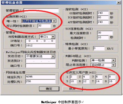 由上圖我們可以看出,NetSniper可以方便地根據(jù)用戶IP地址或MAC地址控制同一網(wǎng)口用戶數(shù)量,用戶數(shù)量控制可以分八級(jí),包括單一用戶和無(wú)限用戶的缺省設(shè)置,一共十級(jí)。用戶數(shù)量按照按自己的意愿定義每一級(jí)用戶可以管理計(jì)算機(jī)的數(shù)量,準(zhǔn)確,靈活,是運(yùn)營(yíng)商增加接入服務(wù)方式的強(qiáng)大基礎(chǔ)。