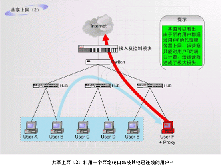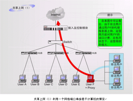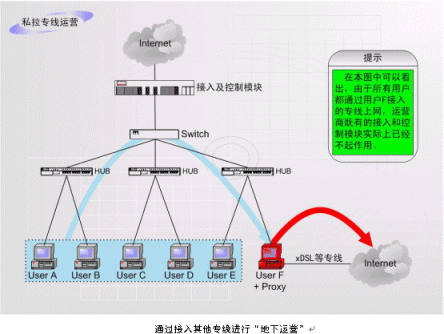 非法運(yùn)營(yíng)情況之二:如上圖中的F用戶作為運(yùn)營(yíng)商的合法包月用戶,上網(wǎng)服務(wù)開(kāi)通以后,在自己的計(jì)算機(jī)中安裝代理服務(wù)軟件或者安裝路由器,這樣就可以隨時(shí)糾集若干住戶分?jǐn)偘沦M(fèi)用,甚至私設(shè)網(wǎng)吧。