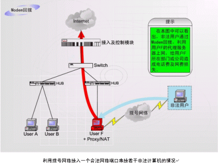 這是在企業(yè)網(wǎng)絡(luò)中常見(jiàn)的情況:如上圖中的F用戶作為企業(yè)的合法用戶,上網(wǎng)服務(wù)開(kāi)通以后,有操作人員在F計(jì)算機(jī)中安裝代理服務(wù)軟件、NAT軟件或者安裝路由器軟件,再安裝Modem等遠(yuǎn)程接入設(shè)備。非法用戶在遠(yuǎn)端通過(guò)Modem等接入設(shè)備與網(wǎng)絡(luò)相連接。