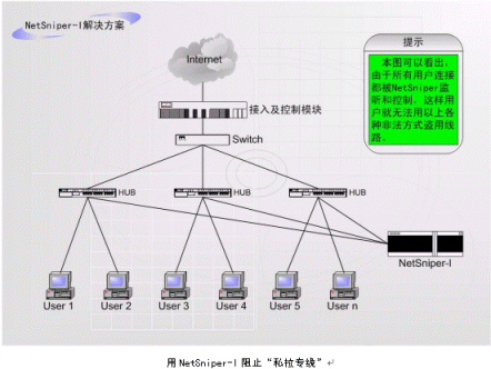 (4)"NetSniper網(wǎng)絡(luò)尖兵"使用起來(lái)非常方便,和運(yùn)營(yíng)商現(xiàn)有的設(shè)備配合極其簡(jiǎn)單:不需要改變現(xiàn)有的網(wǎng)絡(luò)結(jié)構(gòu)、不影響網(wǎng)絡(luò)的性能、與用戶無(wú)關(guān)、集中維護(hù)、控制模式靈活。