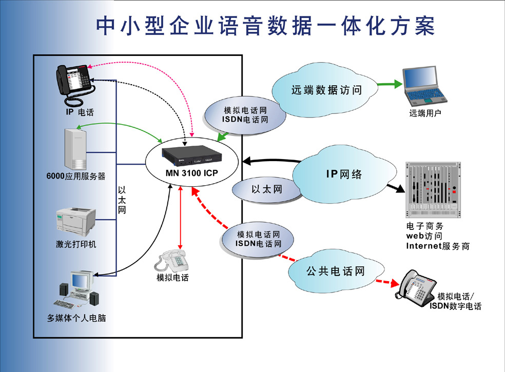 商務(wù)電話系統(tǒng)、本地網(wǎng)和網(wǎng)關(guān)集成在統(tǒng)一的平臺上?敏迪網(wǎng)絡(luò)推出的MN3100綜合通信平臺就是這樣簡單快捷的滿足您的需要,它是專為小型企業(yè)或大型企業(yè)的分支機(jī)構(gòu)而設(shè)計(jì)的語音數(shù)據(jù)集成的解決方案。
