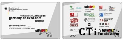 CTI論壇(ctiforum)5月17日消息(記者 潘婷婷):2010年5月,世人矚目的上海世博會(huì)已經(jīng)隆重開幕,德國(guó)館是其中的大熱門之一。想一睹德國(guó)館的風(fēng)采,一般都需要排2~3個(gè)小時(shí)的長(zhǎng)隊(duì)。而觀眾可能不知道除了德國(guó)國(guó)家館外,德國(guó)還有多個(gè)城市在浦西的城市最佳實(shí)踐區(qū)展出。為了讓觀眾更好、更全面地體驗(yàn)德國(guó)參展的所有活動(dòng),德國(guó)駐上?傤I(lǐng)事館聯(lián)手智能卡領(lǐng)域的專家捷德公司共同推出了德國(guó)館智能參觀卡,觀眾只需持卡參觀德國(guó)的其他相關(guān)展區(qū)后,就可以不用排隊(duì)進(jìn)入德國(guó)國(guó)家館了。