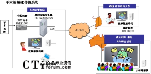 Advanced Network(注2)(以下簡(jiǎn)稱APAN)會(huì)議”醫(yī)療工作組的演示項(xiàng)目,把沖電氣的IP視頻傳輸系統(tǒng)“OKI MediaServer(注3)”接到九州大學(xué)醫(yī)院的遠(yuǎn)程醫(yī)療系統(tǒng)上,同時(shí)向APAN會(huì)場(chǎng)、韓國首爾大學(xué)盆唐(Bundang)醫(yī)院(首爾)、和日本京都第二紅十字醫(yī)院(京都)轉(zhuǎn)播視頻。該視頻傳輸采用了APAN的網(wǎng)線。