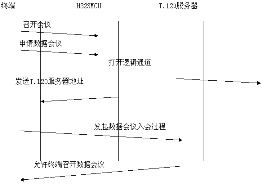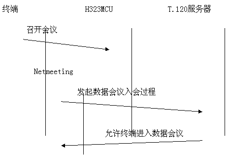 采用帶外方式,數據與音頻視頻流分開,各自占用帶寬。與終端和MCU無任何關系。如果用戶想召開數據會議,需要單獨的一臺PC機來進行數據的接受與傳送,所有需要數據會議功能的用戶的PC機都連接到一個T.120服務器上。目前常用的終端軟件是Netmeeting軟件。數據占用單獨的帶寬,不擠占音視頻的帶寬。會議建立過程為: