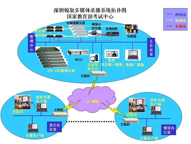 國(guó)家教育部考試中心為了對(duì)高考等大型考試實(shí)時(shí)性指導(dǎo)、監(jiān)考、培訓(xùn)等,特建立了視頻會(huì)議系統(tǒng)、監(jiān)考系統(tǒng)。為了使整個(gè)系統(tǒng)更完善、應(yīng)用價(jià)值更高,因此在此基礎(chǔ)上配置了銳取多媒體錄播系統(tǒng)。不僅實(shí)現(xiàn)了與各地考試中心及考點(diǎn)的圖像、語(yǔ)音和數(shù)據(jù)的交互通訊,還可以輔助系統(tǒng)完成視頻會(huì)議、監(jiān)考系統(tǒng)及培訓(xùn)的錄制、直播和點(diǎn)播功能,錄制、直播和點(diǎn)播的內(nèi)容包括了所有考試中心、考點(diǎn)圖像以及聲音和數(shù)據(jù)信號(hào)。
