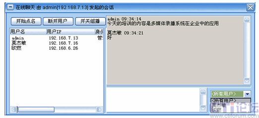 系統(tǒng)增加了多方文字互動(dòng)聊天功能,在線聊天功能可以選擇給所有人員發(fā)送消息,也可以選擇給某一特定人員發(fā)送。這樣在會(huì)議或培訓(xùn)的過程中,管理員可以選擇性的提出相應(yīng)的問題給相關(guān)人員,考核相關(guān)人員的培訓(xùn)效果;其他人員也可以將會(huì)議或培訓(xùn)過程中遇到的疑問、難點(diǎn)及時(shí)的反應(yīng)給管理員進(jìn)行解答,增強(qiáng)會(huì)議的成效。