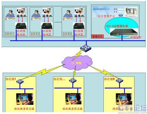 基于上述的需求,經(jīng)過調(diào)研選用深圳銳取錄播服務(wù)器產(chǎn)品完成上述的功能需求。如圖所示,通過放置在每個(gè)會(huì)議室考場內(nèi)的攝像機(jī),將竟聘者的圖像與聲音傳輸?shù)较噙B接的銳取公司的視音頻編碼器上,通過編碼器的編碼將采集的信號(hào)(通過內(nèi)部網(wǎng)絡(luò))傳輸?shù)胶笈_(tái)的管理平臺(tái)上的DSS-R錄播服務(wù)器中。服務(wù)器的直播模塊將從音視頻編碼器接收到的信號(hào)分發(fā)到網(wǎng)絡(luò)中,每個(gè)接入內(nèi)網(wǎng)絡(luò)的辦公室內(nèi)里的電腦通過專有客戶端接收考場實(shí)時(shí)內(nèi)容,實(shí)現(xiàn)了真正意義上的接受機(jī)關(guān)廣大干部群眾的監(jiān)督考察。同時(shí)錄播服務(wù)器內(nèi)置的錄制模塊,將收到的信號(hào)內(nèi)容解碼錄制保存(服務(wù)器內(nèi)有可供存儲(chǔ)的硬盤),為日后干部的選擇做到了有理可依,有據(jù)可查。