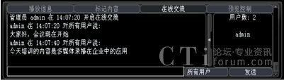 系統(tǒng)增加了多方文字互動(dòng)交流功能,在線交流功能可以選擇給所有人員發(fā)送消息,也可以選擇給某一特定人員發(fā)送。這樣在會(huì)議或培訓(xùn)的過程中,管理員可以選擇性的提出相應(yīng)的問題給相關(guān)人員,考核相關(guān)人員的培訓(xùn)效果;其他人員也可以將會(huì)議或培訓(xùn)過程中遇到的疑問、難點(diǎn)及時(shí)的反應(yīng)給管理員進(jìn)行解答,增強(qiáng)會(huì)議或培訓(xùn)的成效。