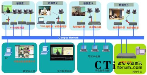 在南洋理工的商學(xué)院中有一個(gè)培訓(xùn)中心,培訓(xùn)中心中有4個(gè)培訓(xùn)課室。 商學(xué)院的老師們希望可以把這4培訓(xùn)課室中的培訓(xùn)課程錄制下來(lái),并可以同時(shí)直播到其它教室。老師可以監(jiān)控這4個(gè)培訓(xùn)課室的培訓(xùn)情況。學(xué)生可以使用PC通過(guò)校園網(wǎng)收看到實(shí)時(shí)的培訓(xùn)情況,及培訓(xùn)后的回放他們可能錯(cuò)過(guò)了的培訓(xùn)。系統(tǒng)可與NTU現(xiàn)有的E_learning系統(tǒng)無(wú)縫融合,為為豐富E_learning的課件資源提供低成本、高效率的制作手段。同時(shí)系統(tǒng)應(yīng)該便于維護(hù)及用戶(hù)界面友好,而且便于以后的擴(kuò)容。因培訓(xùn)室的功能差異,每一間培訓(xùn)室內(nèi)所需記錄的信號(hào)類(lèi)型及數(shù)量均不相同,要求系統(tǒng)能夠進(jìn)行匹配和適應(yīng)。