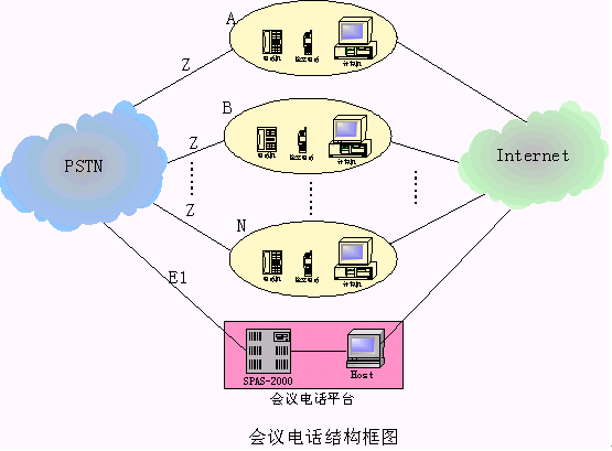 中:SPAS-2000作為組成會議電話平臺的主要交換平臺,Host作為業(yè)務管理平臺,它們共同組成會議電話平臺.A,B,N等作為使用會議電話平臺的用戶,它們有固定電話(作為會議電話使用),手機和電腦.它們均可作為某個會議電話的主持人.