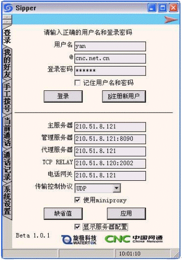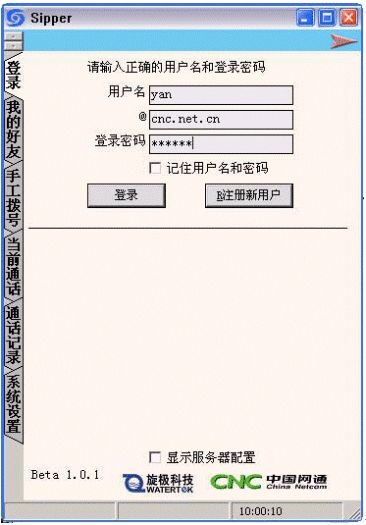 在主界面上選擇"注冊(cè)新用戶",這時(shí)會(huì)出現(xiàn)網(wǎng)通的注冊(cè)界面,選擇"開(kāi)始注冊(cè)",然后將各項(xiàng)用戶信息填寫(xiě)清楚后,創(chuàng)建用戶,成功后即可回到sipper界面登陸。