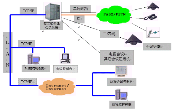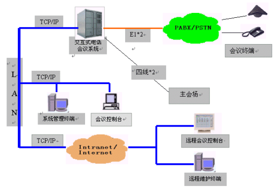 MCU-NT/I交互式電話會議系統(tǒng)為會議用戶提供了強(qiáng)大靈活的會議功能和豐富完善的網(wǎng)管功能。會議功能是在會議終端(或話機(jī))和會議控制臺上實(shí)現(xiàn)的;網(wǎng)管功能是在系統(tǒng)維護(hù)終端上實(shí)現(xiàn)的,并在靈活的組網(wǎng)方式中體現(xiàn)出它的方便易用。系統(tǒng)可以外接多個會議控制臺及多個系統(tǒng)維護(hù)終端,并且可以通過企業(yè)網(wǎng)或互聯(lián)網(wǎng)的遠(yuǎn)程連接,因此,所有功能都是可以遠(yuǎn)程實(shí)現(xiàn)的。