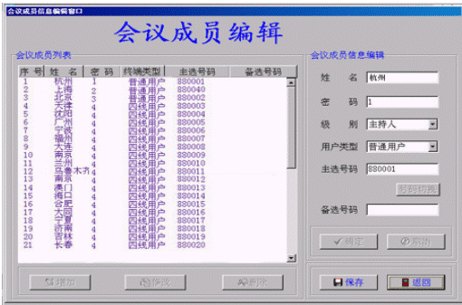 ·成員編輯:即設(shè)置會議成員數(shù)據(jù)。進(jìn)行會議操作之前必須先設(shè)置會議成員數(shù)據(jù)。會議成員數(shù)據(jù)包括:人員姓名、常用號碼、備用號碼、密碼、級別(會議主持人、發(fā)言人、聽眾)。會議主持人一個,會議成員個數(shù)不限,但總數(shù)不超過180個。
