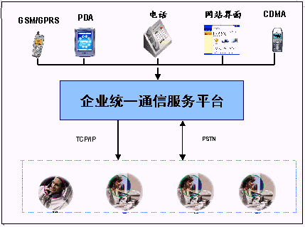 統(tǒng)一通信平臺(tái)提供了與企業(yè)內(nèi)部交換機(jī)(PBX)或PSTN,寬帶或INTERNET和GSM或GPRS網(wǎng)絡(luò)的接口,融合了多種網(wǎng)絡(luò)資源和企業(yè)內(nèi)部數(shù)據(jù)源。為用戶提供了多種服務(wù)界面:WEB界面、人工服務(wù)界面,IVR界面。同時(shí)為用戶提供短信息等數(shù)據(jù)業(yè)務(wù)。