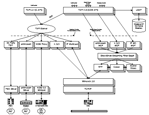 最新的TAPI 3.0基于微軟的COM標準,它允許TAPI應用程序采用包括JAVA?、Visual Basic?、Visual C++?在內(nèi)的各種語言進行編寫,同時還可以方便的通過ActiveX技術將其移植到互聯(lián)網(wǎng)中去。TAPI除了支持傳統(tǒng)的電話應用,還支持標準的H.323會議和IP多點會議,良好的QoS支持使得它增強了會議的質(zhì)量和網(wǎng)絡的可管理性。TAPI采用了統(tǒng)一的媒體流接口-DirectShowTM,TAPI媒體流提供商(MSP)只要針對不同的電話提供商(TSP)來實現(xiàn)DirectShowTM接口就可以被應用程序使用。
