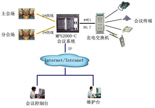 該會(huì)議系統(tǒng)通過4個(gè)數(shù)字中繼,與北電用戶交換機(jī)互連,采用七號(hào)信令。與視頻會(huì)議系統(tǒng)主會(huì)場(chǎng)采用四線音頻接口接主會(huì)場(chǎng)調(diào)音臺(tái),保證與視頻會(huì)議系統(tǒng)音頻的無縫對(duì)接。通過以太網(wǎng)口與局域網(wǎng)連接,實(shí)現(xiàn)維護(hù)管理及會(huì)議控制等功能。