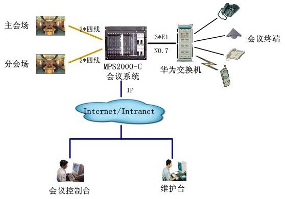 該會議系統(tǒng)和廊坊電力的會議系統(tǒng)組網(wǎng)方式相同,通過3個數(shù)字中繼,與華為用戶交換機互連,通信采用NO.7信令。4路4線中2路接主會場調(diào)音臺,2路接分會場調(diào)音臺,實現(xiàn)會議室擴音設(shè)備的接入。通過以太網(wǎng)口與D-LINK網(wǎng)絡(luò)交換機互連,接入秦皇島電力的局域網(wǎng),實現(xiàn)維護管理及會議控制等功能。