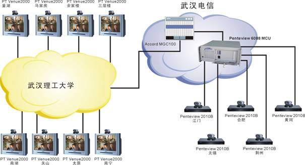 武漢理工大學(xué)的遠(yuǎn)程教學(xué)系統(tǒng)由于分3期建設(shè),網(wǎng)絡(luò)條件較為復(fù)雜。一期主要以PT的Venue2000終端+Accord MGC100 MCU為主,是一個(gè)H323系統(tǒng);二、三期采用中太多媒體的Penteview2010終端+Penteview6088MCU,是一個(gè)H320系統(tǒng),兩套系統(tǒng)通過網(wǎng)關(guān)無(wú)縫結(jié)合到一起工作,用戶根本感覺不到不同。各教室均同時(shí)采用了中太多媒體的遠(yuǎn)程教學(xué)支撐系統(tǒng),通過對(duì)Penteview會(huì)議電視系統(tǒng)的擴(kuò)充,實(shí)現(xiàn)了以下功能,使教學(xué)應(yīng)用更加方便: