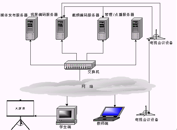 當(dāng)老師端在異地時(shí)(攝像頭離服務(wù)器較遠(yuǎn),無法物理連接),可通過"電視會(huì)議系統(tǒng)"將老師的圖像及聲音實(shí)時(shí)傳送到編碼服務(wù)器,桌面課件可以通過PcAnywhere傳送到編碼服務(wù)器。圖像,聲音和桌面課件通過Web Streaming采集壓縮并在網(wǎng)上實(shí)時(shí)廣播。這種系統(tǒng)架構(gòu)也是當(dāng)今功能比較齊全和完善的一種實(shí)現(xiàn)方式。