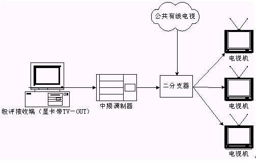 本系統(tǒng)接收端接收實(shí)時(shí)廣播時(shí),除了用普通PC機(jī)收看,或把PC機(jī)接收到的信號(hào)輸?shù)诫娨暎ù笃粒┥鲜湛,甚至還可以接入有線電視網(wǎng)進(jìn)行播放。具體方法是通過一個(gè)接收端接收股評節(jié)目,通過帶TV-OUT的顯卡把TV信號(hào)輸出到中頻調(diào)制設(shè)備,中頻調(diào)制設(shè)備可以把基帶模擬信號(hào)轉(zhuǎn)換成一個(gè)有線電視信號(hào),且傳輸距離遠(yuǎn),損失小,再把這個(gè)信號(hào)與有線電視信號(hào)一起接入一個(gè)二分支器(2進(jìn)1出),這就可以和公共有線電視共存,形成自己的頻道,供電視接收。