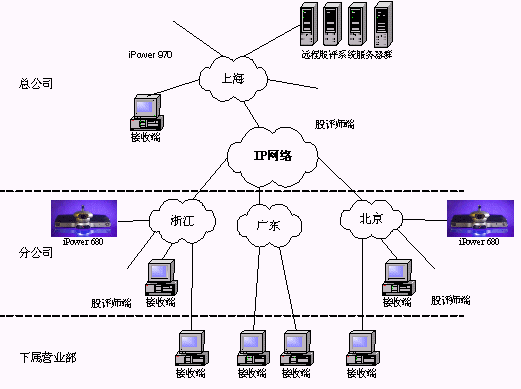 某證券公司有三級(jí)網(wǎng)絡(luò),總公司、分公司和下屬營業(yè)部?偣镜椒止編捠2M,在總公司配置一套會(huì)議室型電視會(huì)議終端POLYCOM 970和一套多點(diǎn)會(huì)議服務(wù)器Radvision ViaIP400。在分公司配置了38套會(huì)議室型電視會(huì)議終端POLYCOM 680,用于與總公司進(jìn)行雙向視頻會(huì)議。分公司到營業(yè)部帶寬是512K,各營業(yè)部安裝遠(yuǎn)程股評系統(tǒng)接收端程序,遠(yuǎn)程股評系統(tǒng)服務(wù)器都放置在海通總公司。當(dāng)在總公司進(jìn)行股評時(shí),總公司本地?cái)z像頭拍攝教師畫面,MIC采集教師聲音,傳給服務(wù)器編碼,再通過網(wǎng)絡(luò)供各個(gè)接收端接收;當(dāng)在分公司進(jìn)行股評時(shí),首先分公司的電視會(huì)議設(shè)備采集教師畫面及聲音傳回總公司的電視會(huì)議設(shè)備,再傳給遠(yuǎn)程股評系統(tǒng)的服務(wù)器進(jìn)行編碼,然后通過網(wǎng)絡(luò)發(fā)布,供接收端接收。(結(jié)構(gòu)如下圖)