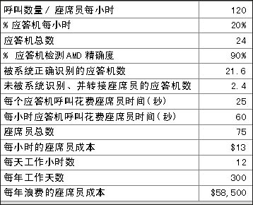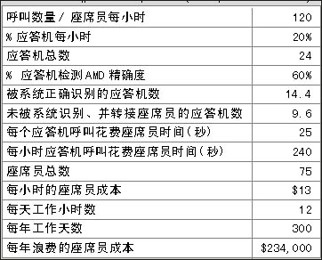 表1和表2表明在一個呼叫中心中精確的應(yīng)答機(jī)檢測(AMD)給企業(yè)所帶來的價值,兩表之間關(guān)于呼叫中心運營的費用每年相差$175,500。那么不同的AMD精確度意味著什么?在上例中,精確度每增加1%意味著每年會減少約$5,850的損失。
