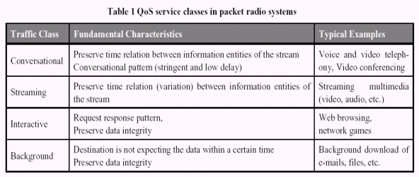 3G無線傳輸堆棧通常由二種不同類型的輸送介質(zhì)組成,專用和共享信道。然而,使用專用信道用戶可以獲得固定帶寬用于傳輸數(shù)據(jù),但使用共享信道用戶只有在動(dòng)態(tài)的帶寬下傳輸數(shù)據(jù),類似于ATM或GSM GPRS。HSDPA將會(huì)成為共享信道在空中的一個(gè)擴(kuò)展。除了MMS,在3G系統(tǒng)的初始階段所有的流媒體和會(huì)話應(yīng)用都希望使用專用信道。 在現(xiàn)代的系統(tǒng)設(shè)計(jì)中,一個(gè)應(yīng)用可以請求許多不同的服務(wù)質(zhì)量(QoS)級別的其中之一。服務(wù)質(zhì)量級別包含最大誤碼率、最大延遲和最大保證的帶寬等參數(shù)。此外,通常根據(jù)不同的應(yīng)用分為不同的服務(wù)級別:會(huì)話應(yīng)用、流媒體應(yīng)用、交互應(yīng)用以及后臺(tái)通信應(yīng)用。特性和典型的例子見表1。
