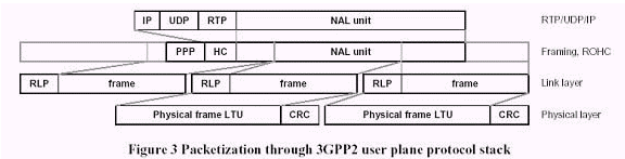 因?yàn)榘粨Q服務(wù),3GPP/3GPP2同意了一個(gè)基于IP的協(xié)議棧。圖3展示了一個(gè)NAL單元通過3GPP2用戶平面協(xié)議堆棧被封裝在RTP/UDP/IP的典型過程。在頭壓縮(RoHC)后,此IP/UDP/RTP包被封裝進(jìn)一個(gè)PDCP/PPP2包,變成了頻率鏈路控制(RLC)和服務(wù)數(shù)據(jù)單元(SDU)。RLC協(xié)議可以在三種模式下工作:透明、非確認(rèn)和確認(rèn)模式。RLC協(xié)議為用戶和數(shù)據(jù)提供分段和重傳服務(wù)。在透明和非確認(rèn)模式,RLC被定義為單向的;在確認(rèn)模式,RLC被定義為雙向的。對於所有的RLC模式,循環(huán)冗余檢查(CRC)的錯(cuò)誤檢測在物理層上被運(yùn)行,而且CRC檢查的結(jié)果和真實(shí)的數(shù)據(jù)一起被遞送到 RLC。在透明模式中,沒有上層的協(xié)議被增加到較高層的數(shù)據(jù)中。錯(cuò)誤的協(xié)議數(shù)據(jù)單元(PDUs)可以被丟棄或標(biāo)記為錯(cuò)誤。在非確認(rèn)模式中,沒有重傳協(xié)議在使用中,而且數(shù)據(jù)傳送沒有保證。接受到的錯(cuò)誤數(shù)據(jù)根據(jù)配置來決定丟棄或標(biāo)記為錯(cuò)誤。在確認(rèn)模式中,一種自動(dòng)的重復(fù)請求機(jī)制被用于錯(cuò)誤訂正。