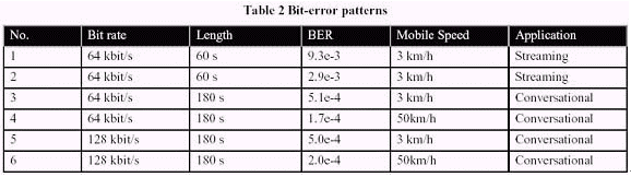 在H.264/AVC的標(biāo)準(zhǔn)化進(jìn)程中,移動(dòng)視頻傳輸?shù)闹匾砸呀?jīng)在3G移動(dòng)傳輸里面通過對基于H.324M的電路交換會(huì)話服務(wù)、包交換會(huì)話和流服務(wù)得到了證實(shí)。這些測試情況允許適當(dāng)?shù)木幋a特征、測試和容錯(cuò)仿真等特征的選擇,同時(shí)也可以得到有意義的測試結(jié)果。在本文,我們將會(huì)把重心集中在基于IP的測試情況。在正常的測試情況下,我們會(huì)定義6個(gè)測試情形組合,主要測試通過3G移動(dòng)網(wǎng)絡(luò)的包交換會(huì)話服務(wù)和包交換流媒體服務(wù)。另外,測試環(huán)境包括簡單的脫機(jī)3GPP/3GPP2仿真軟件、程序接口和評估標(biāo)準(zhǔn)。無線信道使用專門生產(chǎn)用于移動(dòng)無線信道仿真的位率差錯(cuò)模板來進(jìn)行仿真。 位率差錯(cuò)模板在物理層上和RLC/RLP層下來捕獲,因此,它們在實(shí)驗(yàn)被用于物理層仿真。通過位率差錯(cuò)模板實(shí)驗(yàn)中得出的碼率、長度、位錯(cuò)誤率和移動(dòng)速度數(shù)據(jù)詳見下表2。