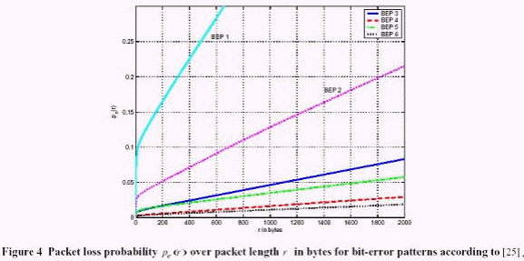 數(shù)組3到6的仿真結(jié)果更可靠,在會(huì)話應(yīng)用中需要低錯(cuò)誤率的運(yùn)送者。 假定一任意的字節(jié)的開始位置在文件包可能發(fā)生錯(cuò)誤的位置里面。 這些錯(cuò)誤可能性的所有數(shù)據(jù)錯(cuò)誤在圖4中被顯示。 明顯可以看出錯(cuò)誤率會(huì)因?yàn)榘L度的增加而提高。從位率錯(cuò)誤表格(BEP1和2)可知,當(dāng)包長度減少的時(shí)候丟包率是不可以接受的, 舉例來說,500個(gè)字節(jié), 丟失可能性高達(dá)25%. 高的錯(cuò)誤率需要在鏈路層上重傳。