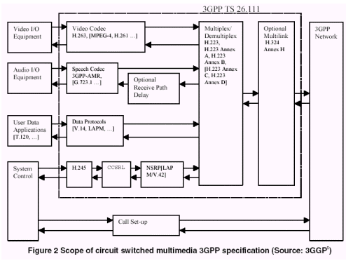 3G網(wǎng)絡(luò)上用于視頻通訊的3GPP標準定義了使用于視頻消息傳送(參看3.3部分)和視頻呼叫的視頻解碼器。在交換線路上實行64kbps速率的實時呼叫時,H.263是推薦標準,如圖2所示?蛇x的其他視頻解碼器中,MPEG-4和H.261不是標準所要求的,但可作為可能的候選標準。