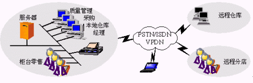 支持遠(yuǎn)程庫房、遠(yuǎn)程分店以及移動辦公。網(wǎng)絡(luò)拓?fù)浣Y(jié)構(gòu)與連鎖經(jīng)營企業(yè)基本相同。