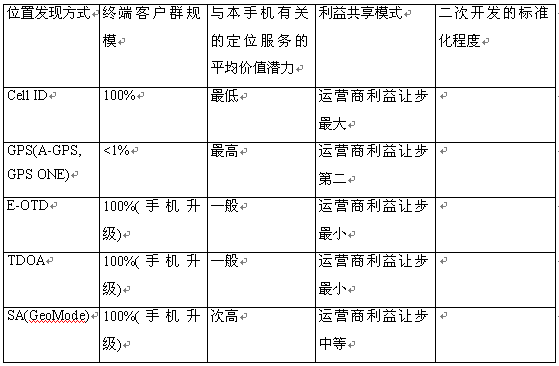 根據(jù)位置發(fā)現(xiàn)策略的不同,已經(jīng)有很多的成熟技術(shù)可選---Cell ID、GPS(A-GPS = GPS + Cell ID)、TDOA/E-OTD/TDOA、SA(信號(hào)衰減,