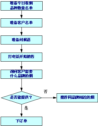 。。我們的訪(fǎng)銷(xiāo)流程是:準(zhǔn)備今日卷煙品種數(shù)量名單---準(zhǔn)備客戶(hù)名單---準(zhǔn)備問(wèn)候語(yǔ)---打電話(huà)開(kāi)始銷(xiāo)售---先問(wèn)客戶(hù)需要什么煙---如能提供的就下訂單。如有不能提供的,向其推薦同品牌相近的煙 。 (請(qǐng)?jiān)斠?jiàn)以下流程圖)