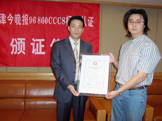 2004年9月9日,天津今晚報(bào)公眾服務(wù)中心通過(guò)了《全國(guó)呼叫中心運(yùn)營(yíng)績(jī)效標(biāo)準(zhǔn)》(CCCS-OP-2003)認(rèn)證,并獲得由中國(guó)信息化推進(jìn)聯(lián)盟客戶(hù)關(guān)系管理專(zhuān)業(yè)委員會(huì)頒發(fā)的認(rèn)證證書(shū)(四星級(jí)客戶(hù)服務(wù)中心),成為國(guó)內(nèi)傳媒業(yè)首家通過(guò)此認(rèn)證的呼叫中心。