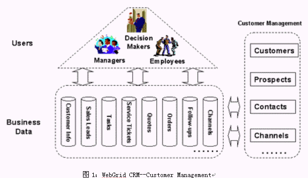 WebGrid CRM是基于CRM理念而設(shè)計的,它將面向客戶的所有業(yè)務(wù)進(jìn)行整合,提供了統(tǒng)一的業(yè)務(wù)平臺,并使用工作流技術(shù)將各種業(yè)務(wù)緊密聯(lián)系起來。WebGrid CRM 的功能可以歸納為三個方面:1) 對銷售、營銷和客戶服務(wù)三部分業(yè)務(wù)流程的信息化;2) 與客戶進(jìn)行溝通所需要的手段(如電話、傳真、網(wǎng)絡(luò)、Email等)的集成和自動化處理;3) 對上面兩部分功能所積累下的信息進(jìn)行的加工處理,產(chǎn)生客戶智能,為企業(yè)的戰(zhàn)略戰(zhàn)術(shù)的決策作支持。見下圖所示:
