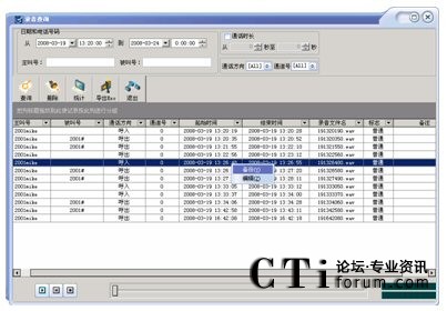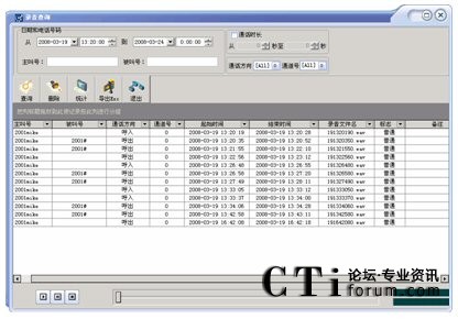 可按通道號,日期,時間,撥出/入電話號碼等多種方式進行單個和組合查詢,查詢方便快捷,數(shù)據(jù)表的下邊還顯示出數(shù)據(jù)資料的統(tǒng)計。并可根據(jù)通話內(nèi)容及聯(lián)系人等重要信息對錄音文件進行編輯?梢匀我獠シ乓粋錄音或選擇多個錄音依次播放,放音時將彈出當(dāng)前語音文件的放音進度等信息。